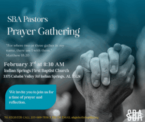 This week the SBA would like to highlight Bethlehem Baptist Church and Beulah Baptist Church and their leadership. We are grateful for their partnership in “making disciples by meeting needs…” in Shelby County and beyond. Please take time to lift up each of these churches this week as you pray. Ask God to protect and provide for them in the ministries and mission endeavors. Pray for God to grow them in His Word to be faithful and reproducing disciples of Christ.